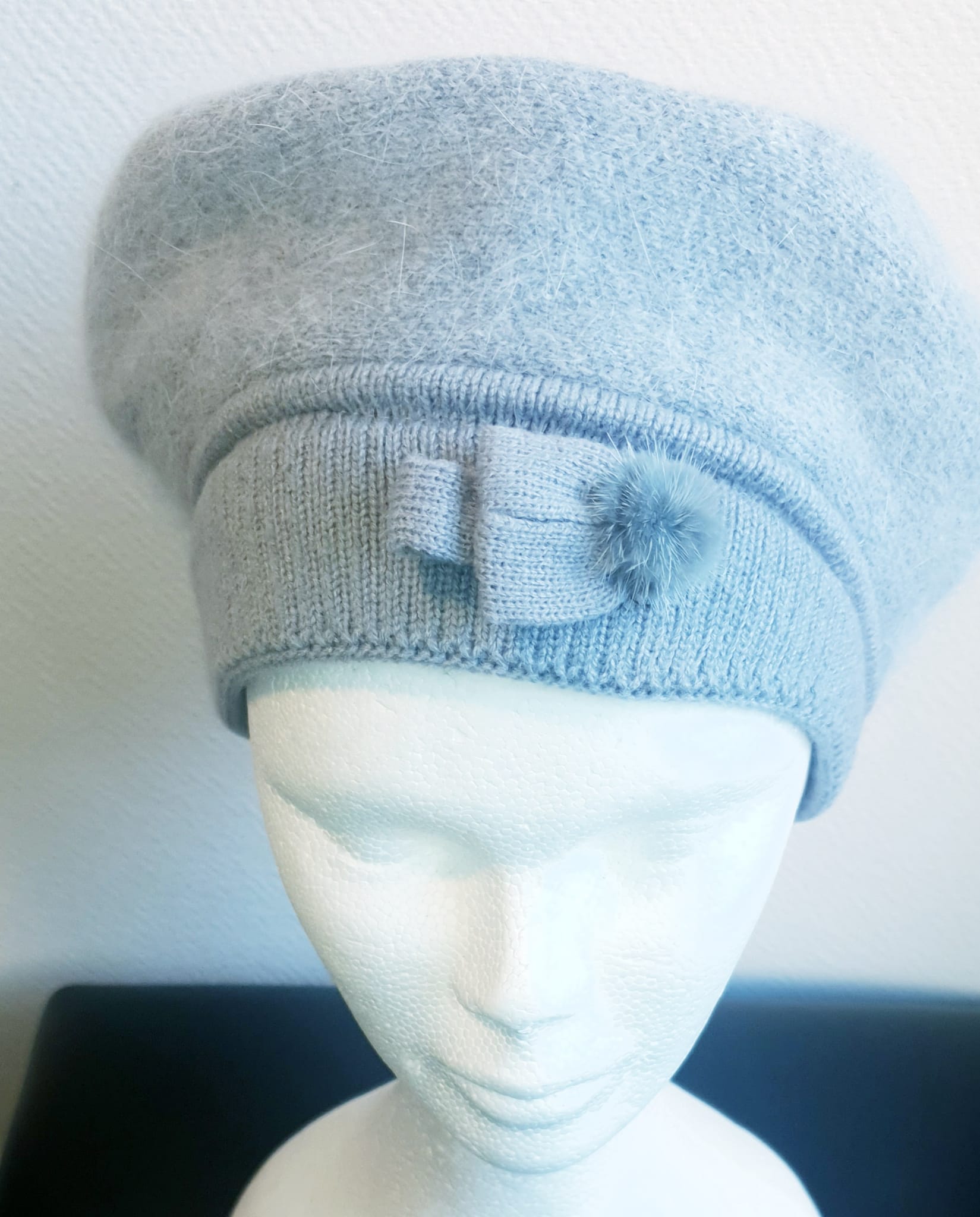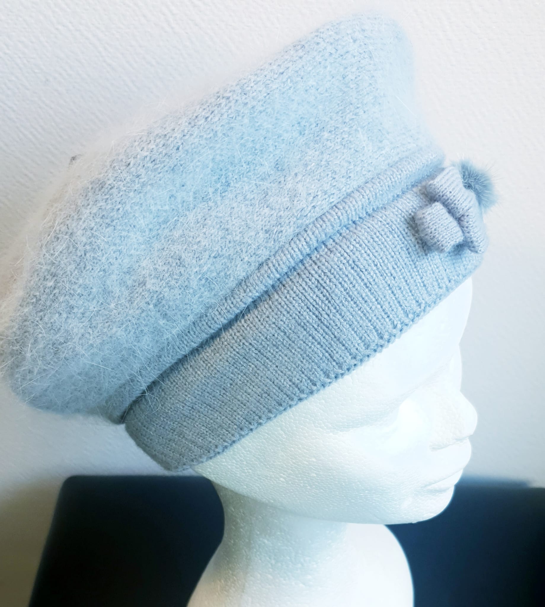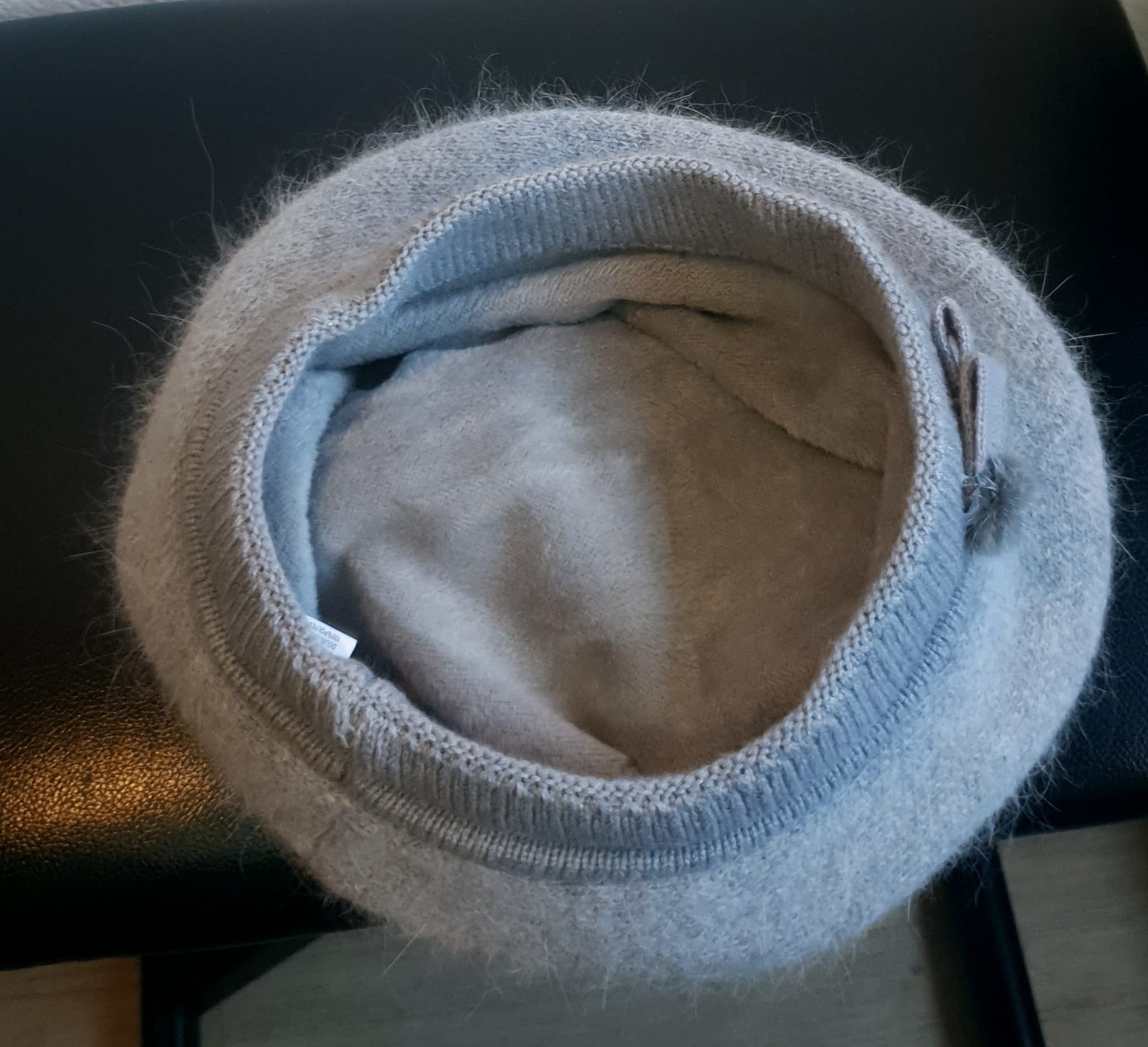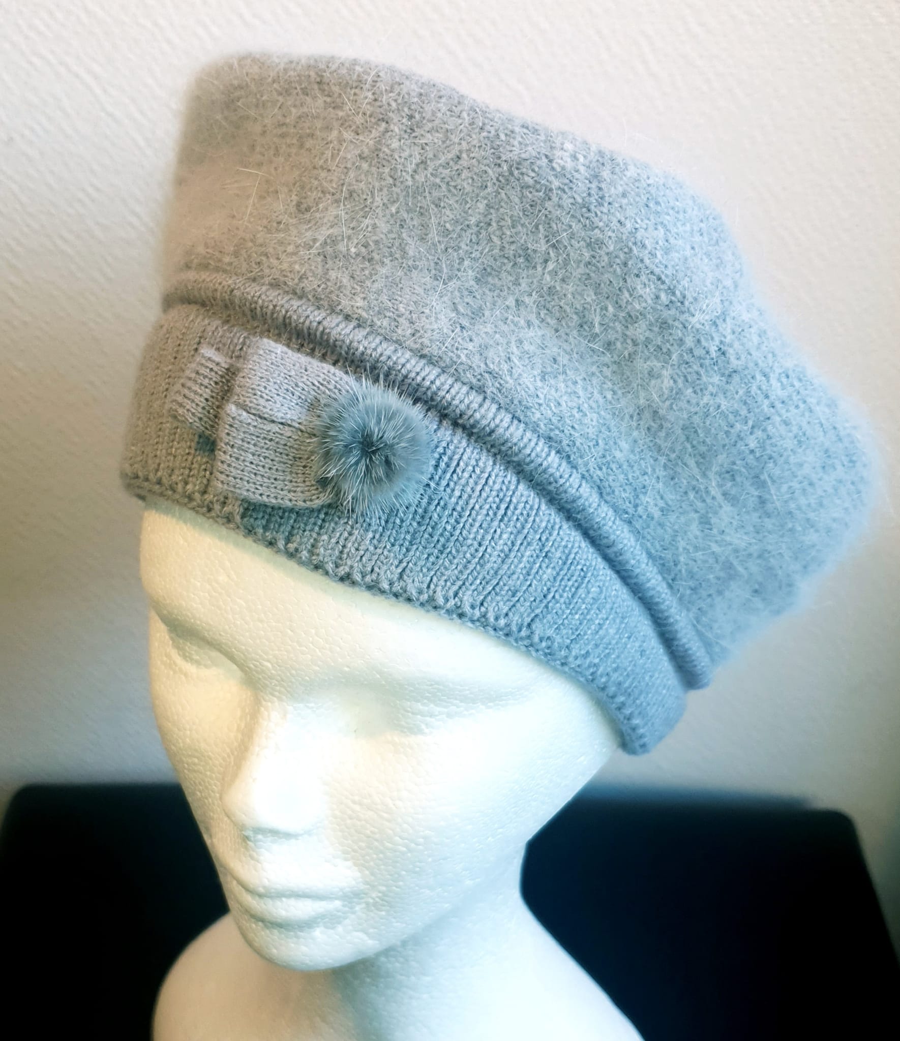 Béret d’hiver sur un ton gris clair. Il se compose textilement de laine mélangée, de nylon, viscose, polyester, angora entièrement doublé, s’adaptant à toutes les formes de tête et doux à porter. Taille unique.