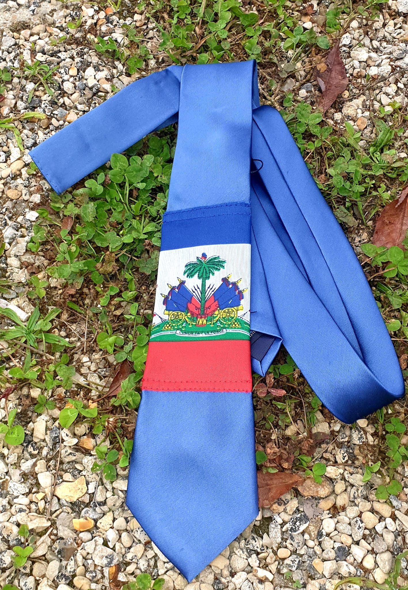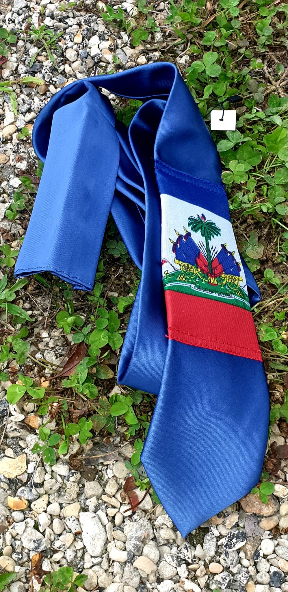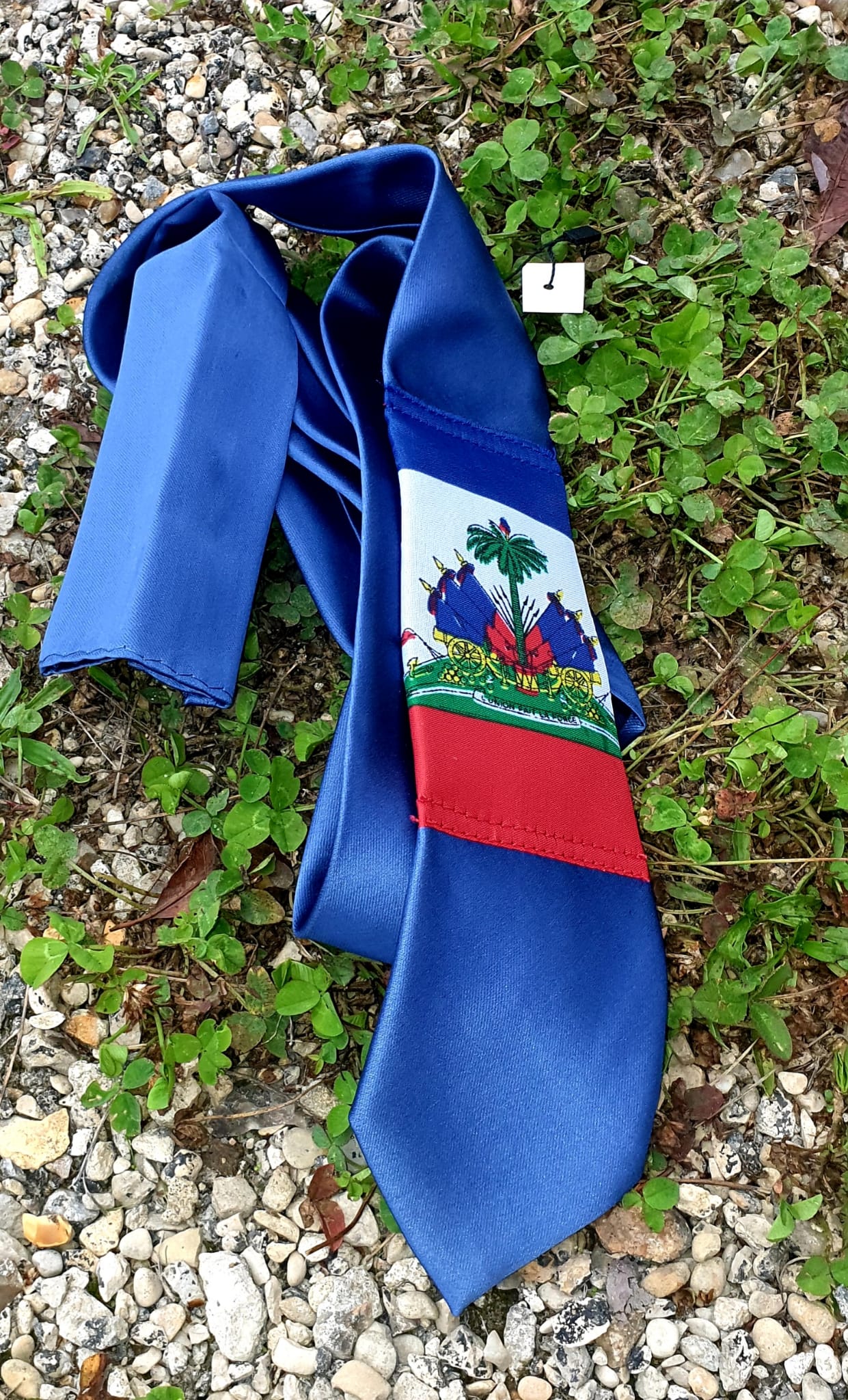 Cravate sur un bleu foncé assortie d’une pochette en harmonie et se caractérisant sur son devant par la distinction du drapeau Haïti.