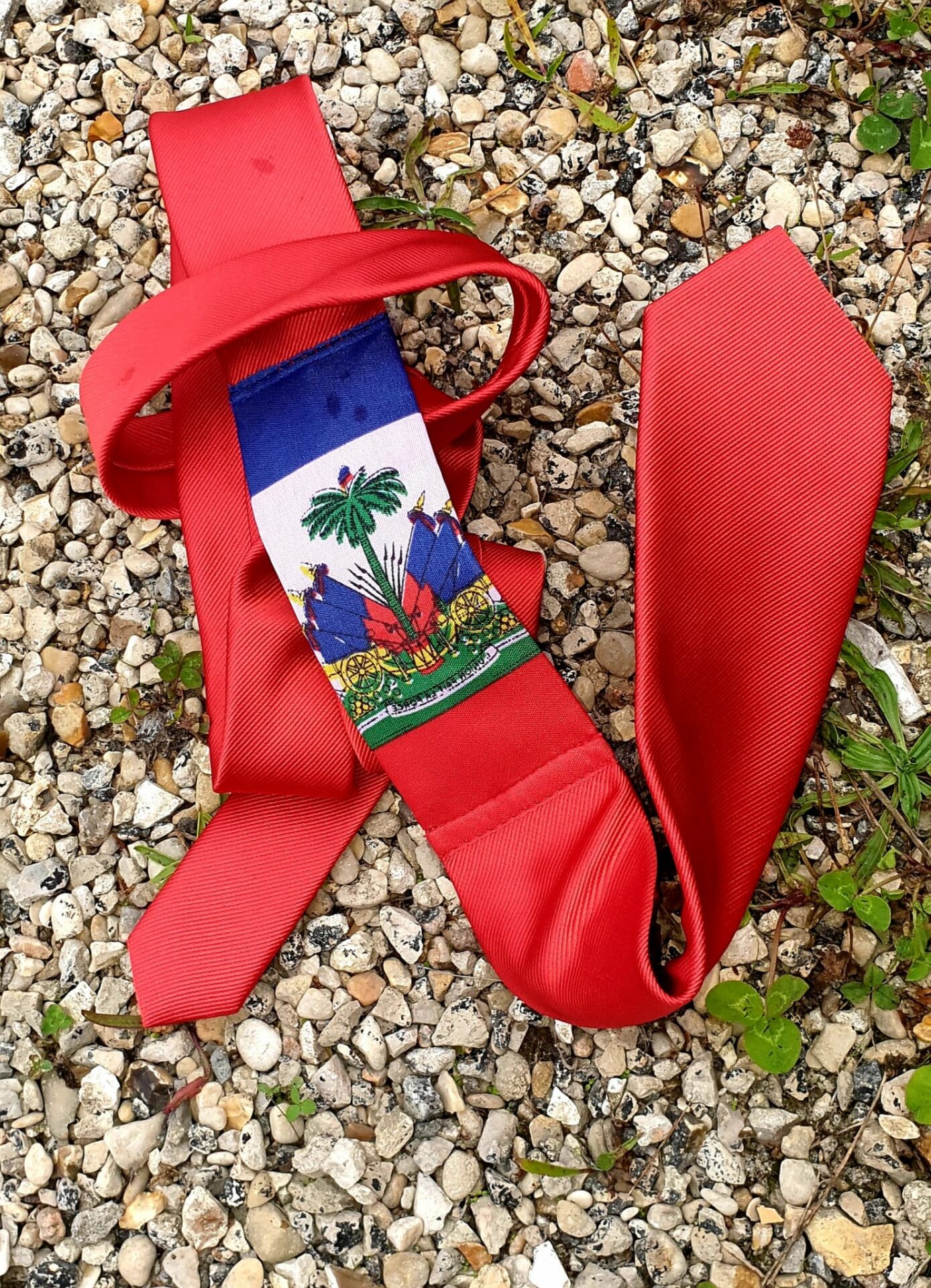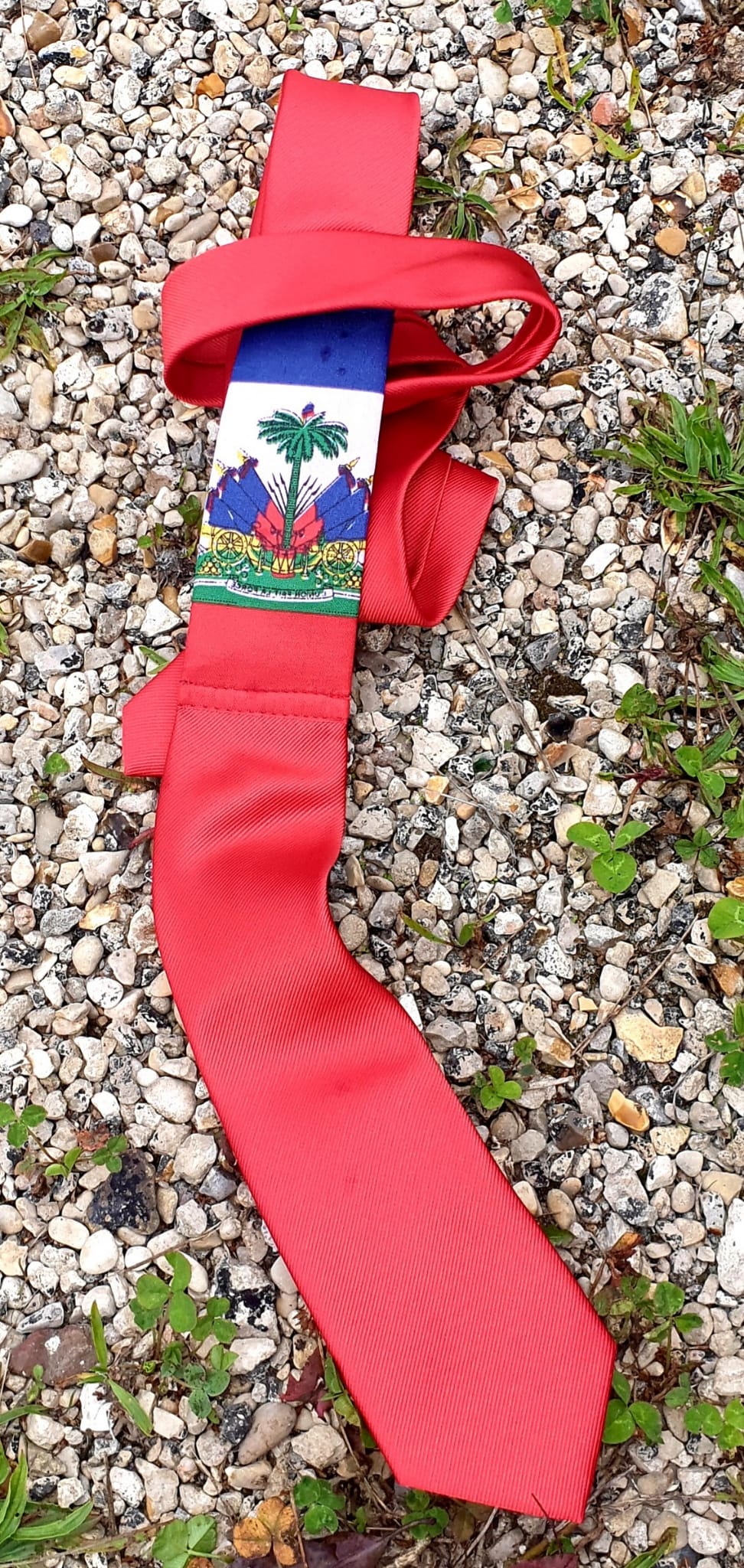Cravate sur un rouge orangé et se caractérisant sur son devant par la distinction du drapeau Haïti.