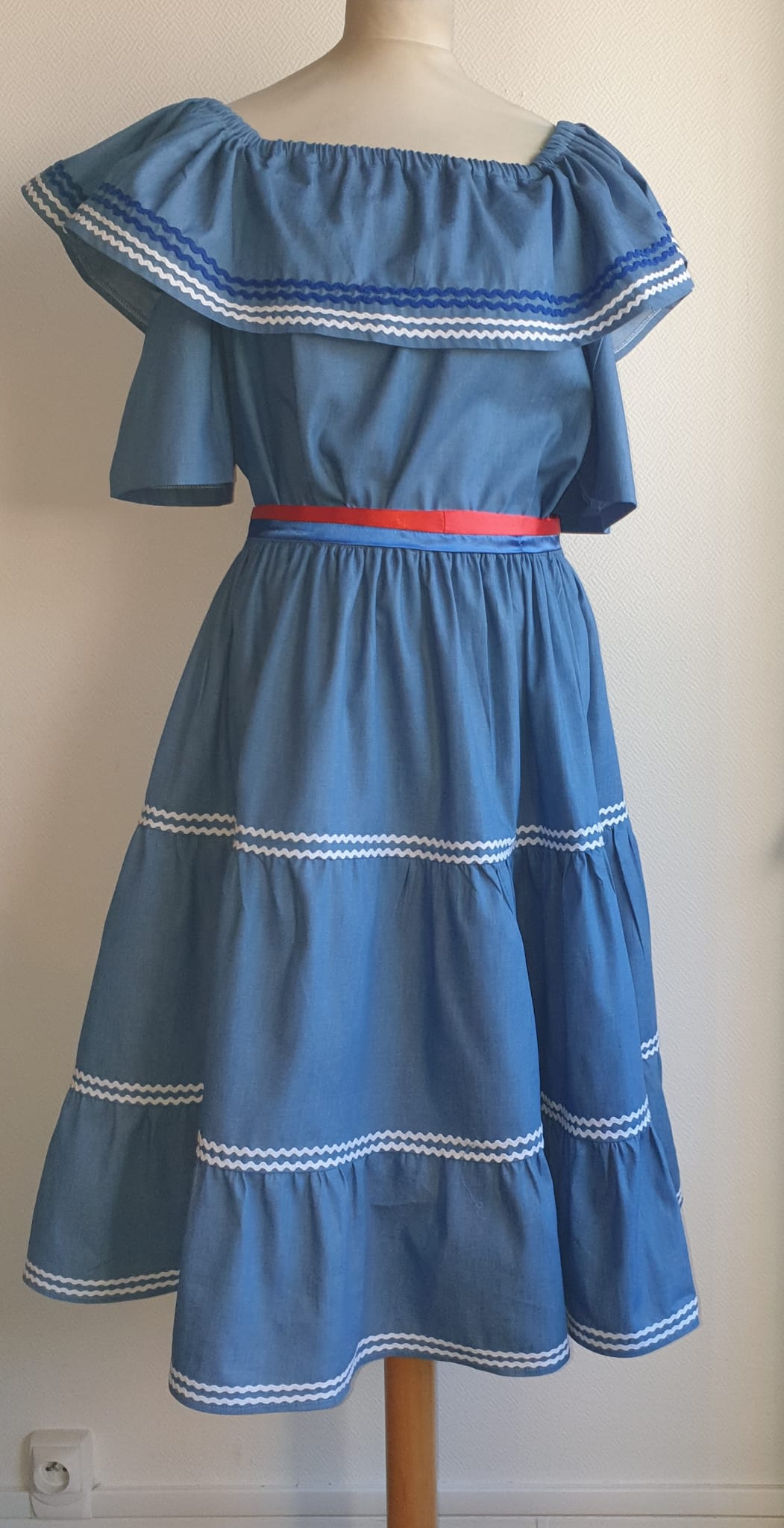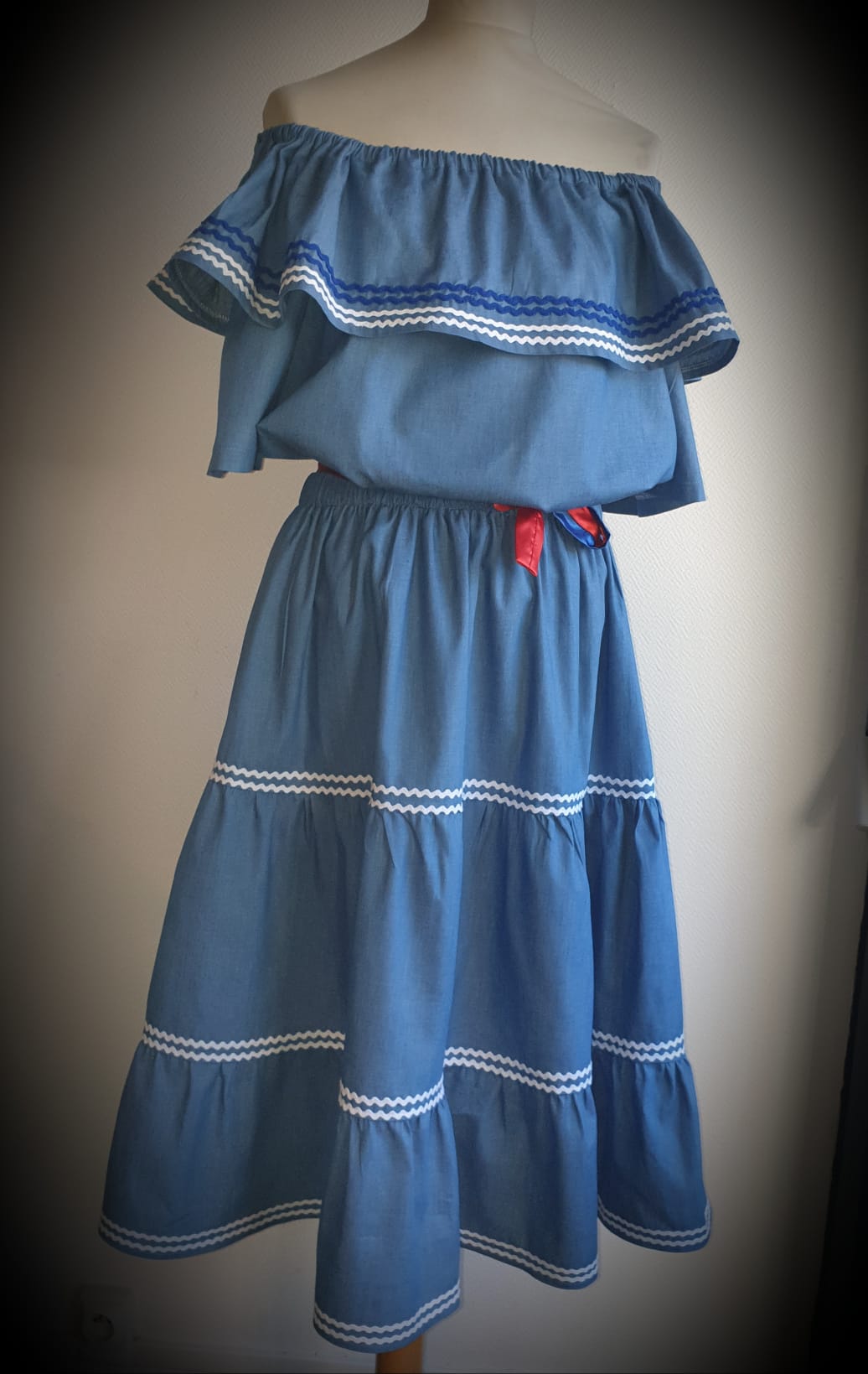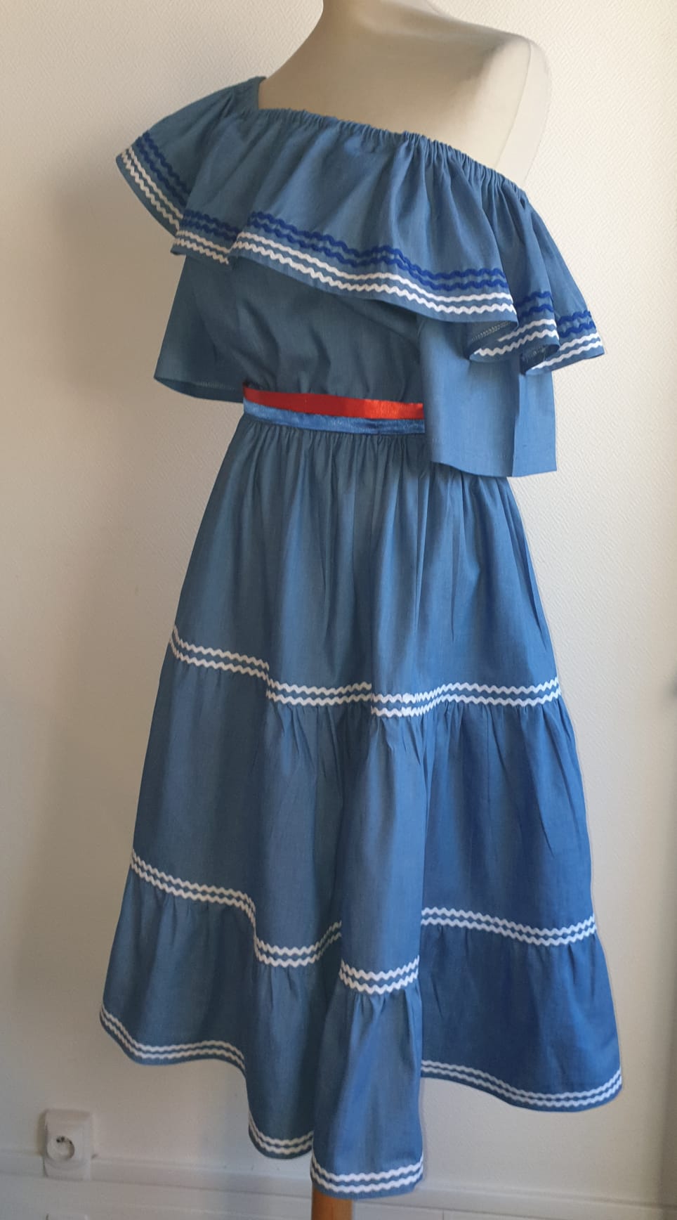 Ensemble carabela en bleu avec manches courtes sur une tenue traditionnelle haïtienne. Cette confection est pourvue de deux pièces appareillées d’une ceinture bicolore rouge et bleue. Cet ensemble est entièrement conçu et réalisé dans les ateliers AnjeroCreation à Paris.
