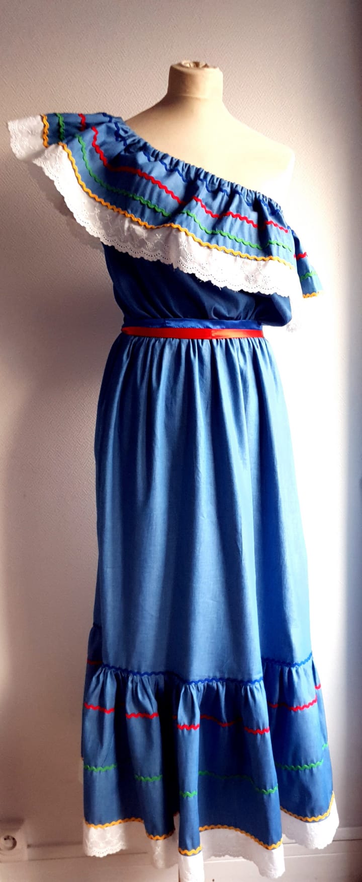Robe carabela sur une tenue traditionnelle haïtienne en maxi. Elastique à la taille et livrée avec une ceinture bicolore rouge bleue. Cette robe est entièrement conçue et réalisée à Paris dans les ateliers AnjeroCréation.