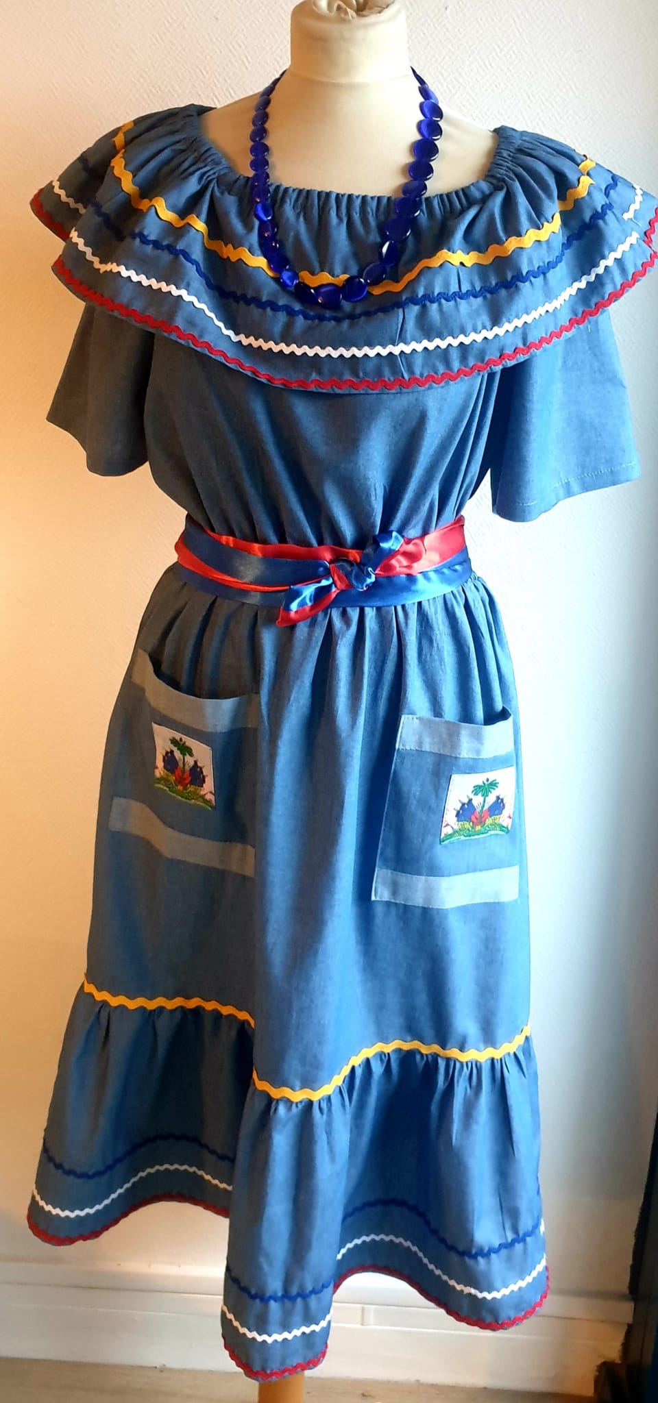 Robe carabela sur une tenue traditionnelle haïtienne aux manches mi-longues, deux poches à mi-hauteur de la confection et un col bardot. Zigzags multicolors sur le contour. Élastique à la taille. Ceinture bicolore. Création artisanale. Entièrement conçue et réalisée aux ateliers AnjeroCréation à Paris.