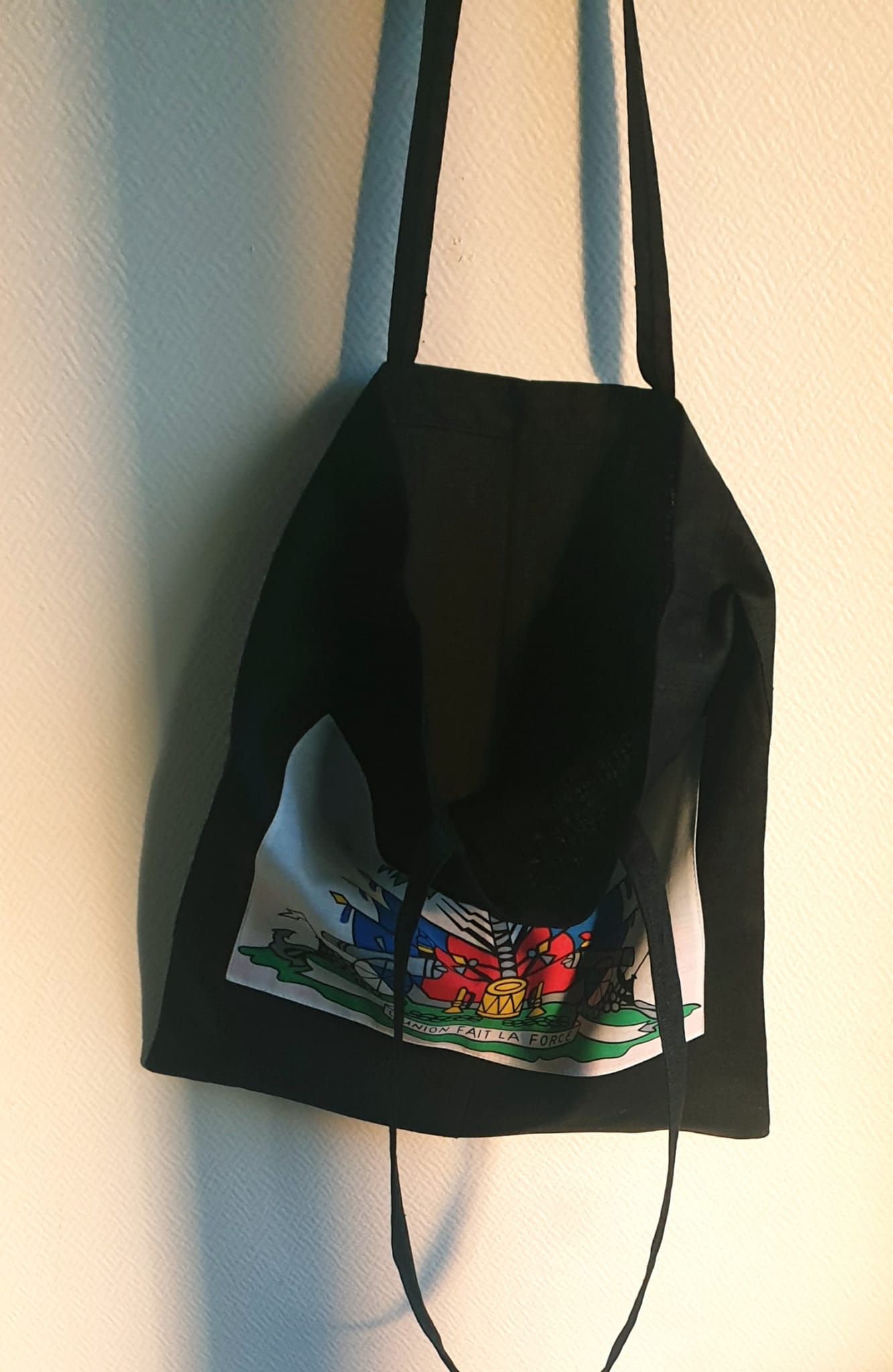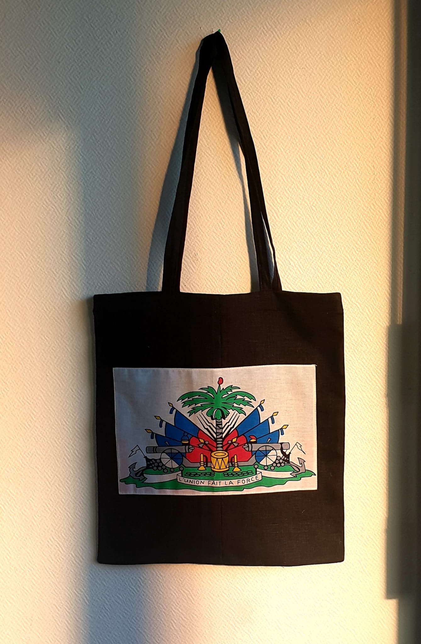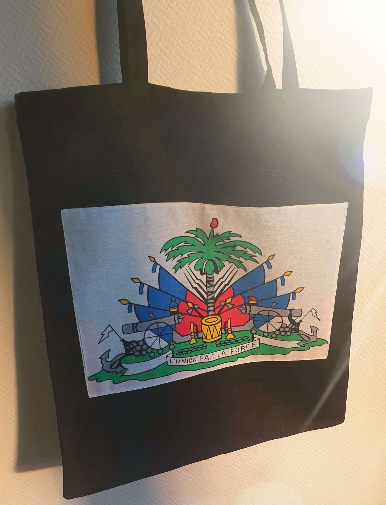 Sac orné en son centre du magnifique drapeau Haïti sur un tissage tout en lin, confectionné avec une longueur d’anse tout à fait appréciable et permettant une grande liberté de mouvement. il arbore de surcroît sur l’un de ses côtés, une couleur faite d’un bleu foncé sans motif aucun. Création artisanale. Ce style de production est entièrement conçu et réalisé aux ateliers AnjeroCréation à Paris.