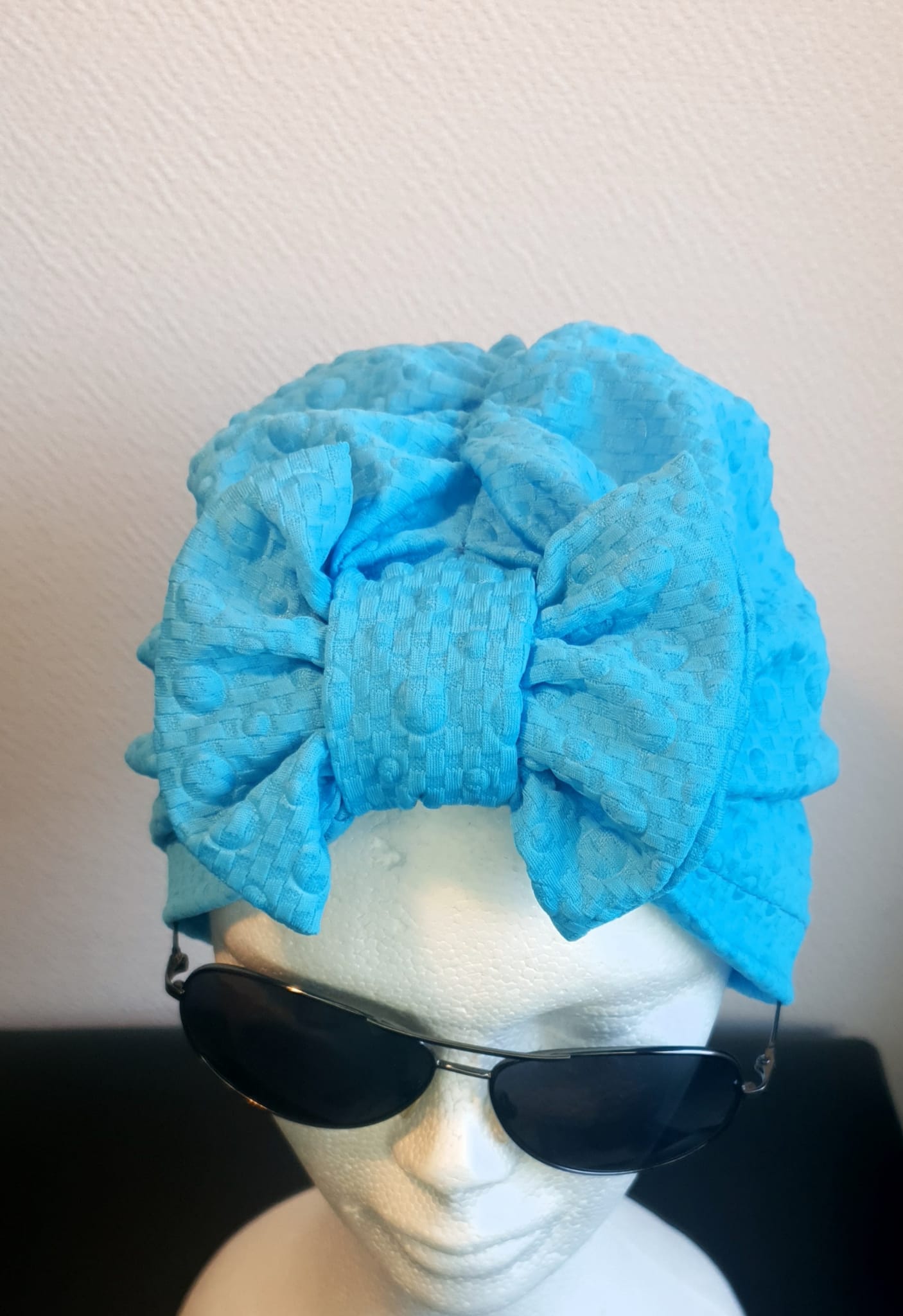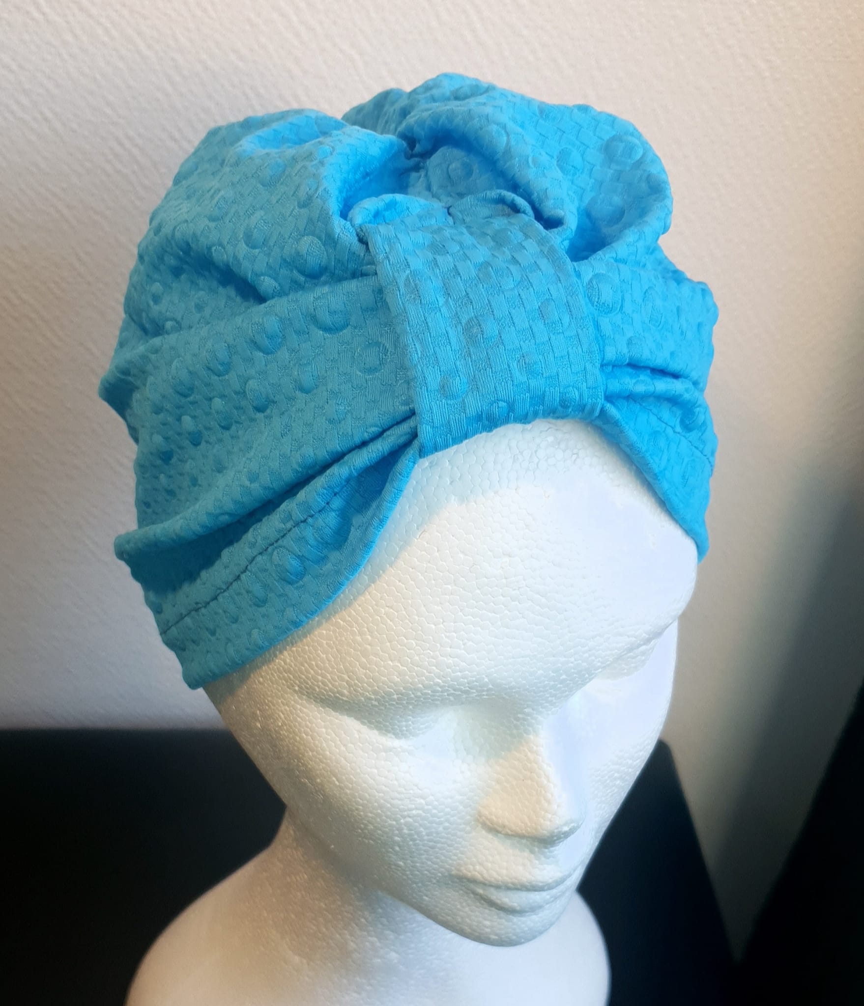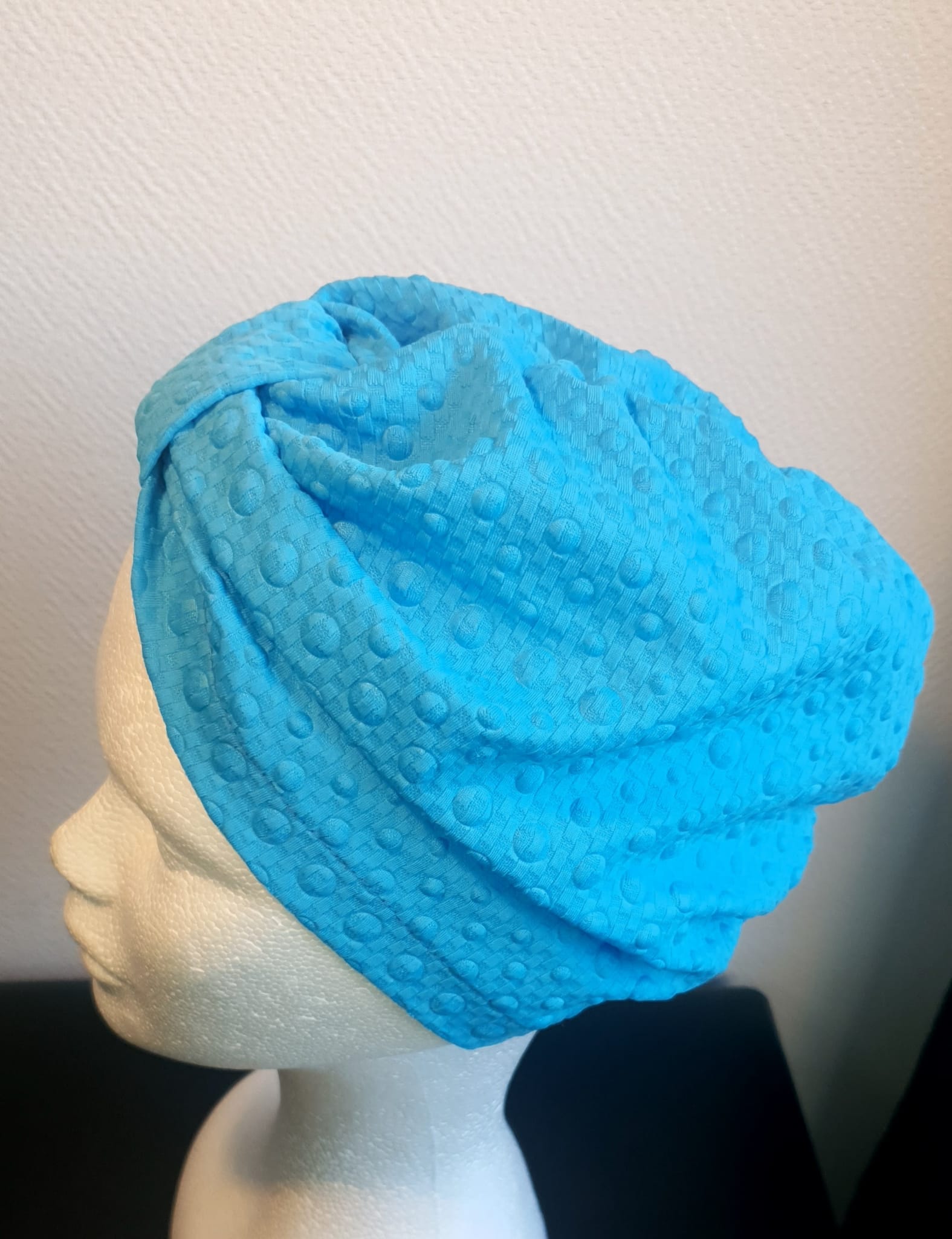 Turban original en polyester de couleur turquoise offrant une variété de styles, s’accommandant à toutes les formes de tête. Taille unique. Ce produit est conçu et entièrement  réalisé dans les ateliers AnjeroCréation à Paris.
